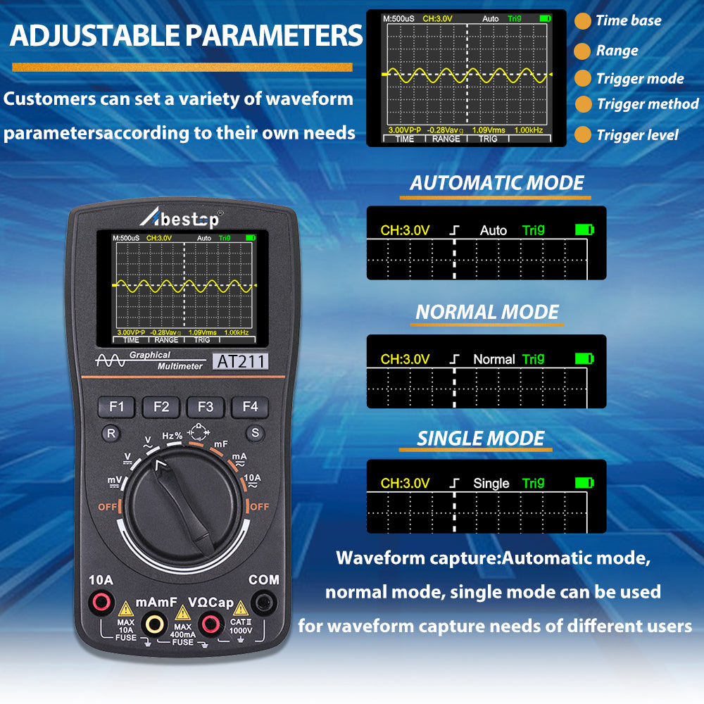 - Parameter: 2.5Msps high-speed sampling, 1MHz analog bandwidth(Only for oscilloscopes with ACV), 4000 count digital multimeter. Overload protection 500mA/10A double protective tube, dual protection of the instrument.