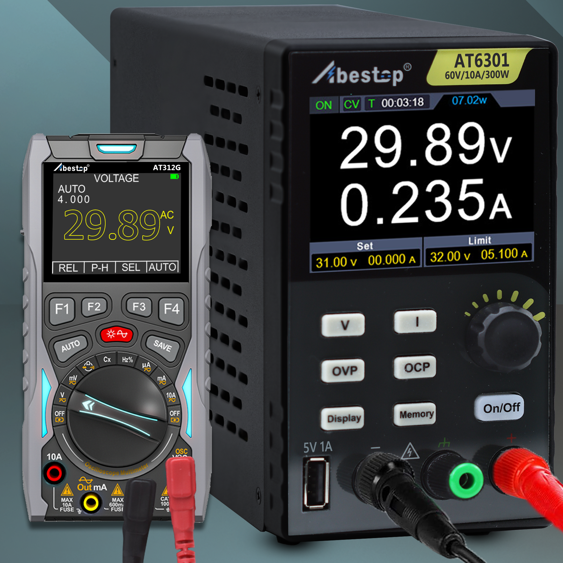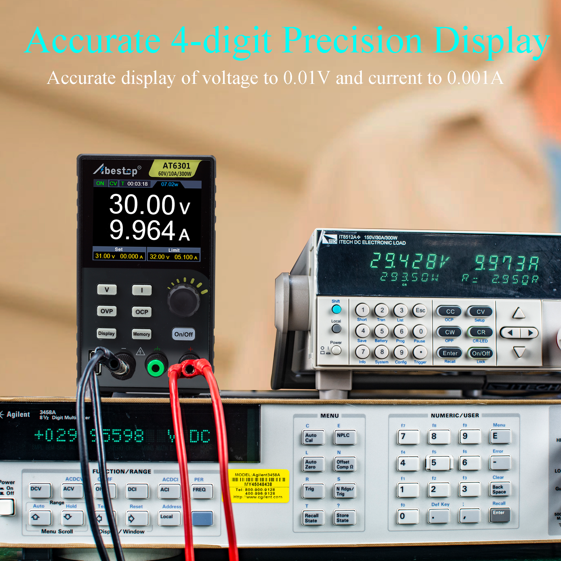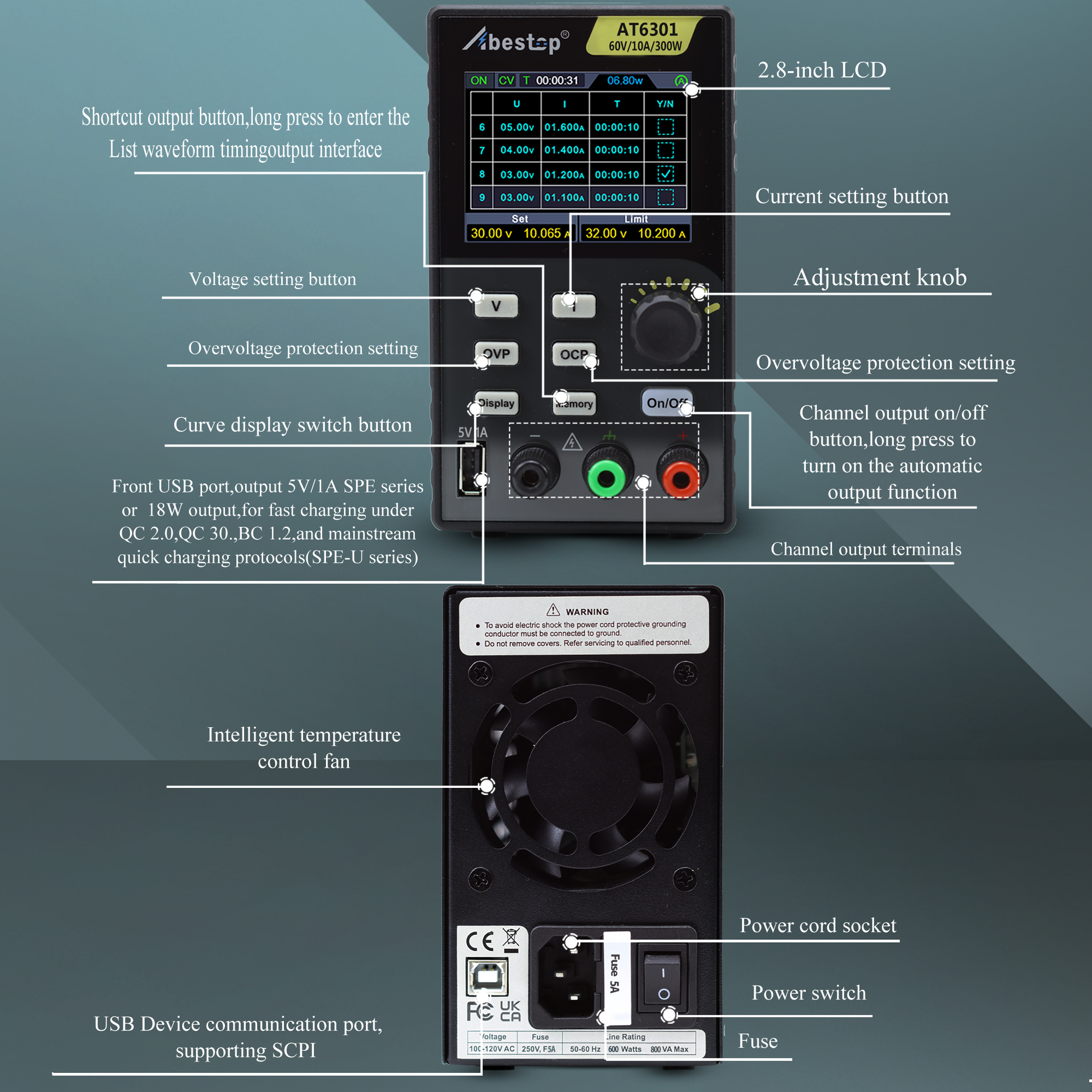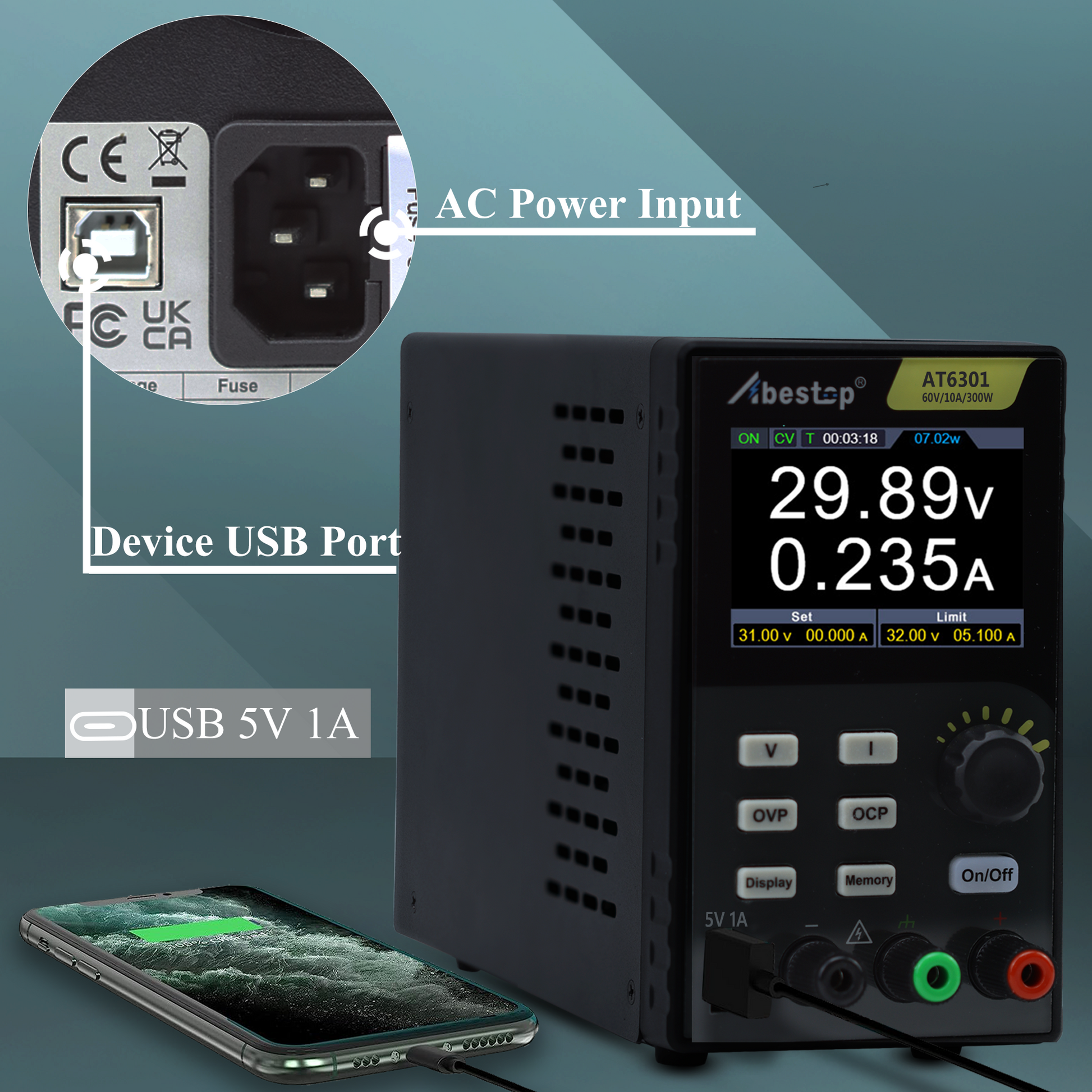 - 【Parameter(AT6301)】Output Ranges: 0~60V/0~10A,Output Power: 300W; USB Port: 5V/1A; 50-60Hz; High resolution: 10mV /1mA; Working Temperature: 0-40℃; Storage 4 groups of data;2.8-inch TFT LCD display. USB communication interface,support SCPI