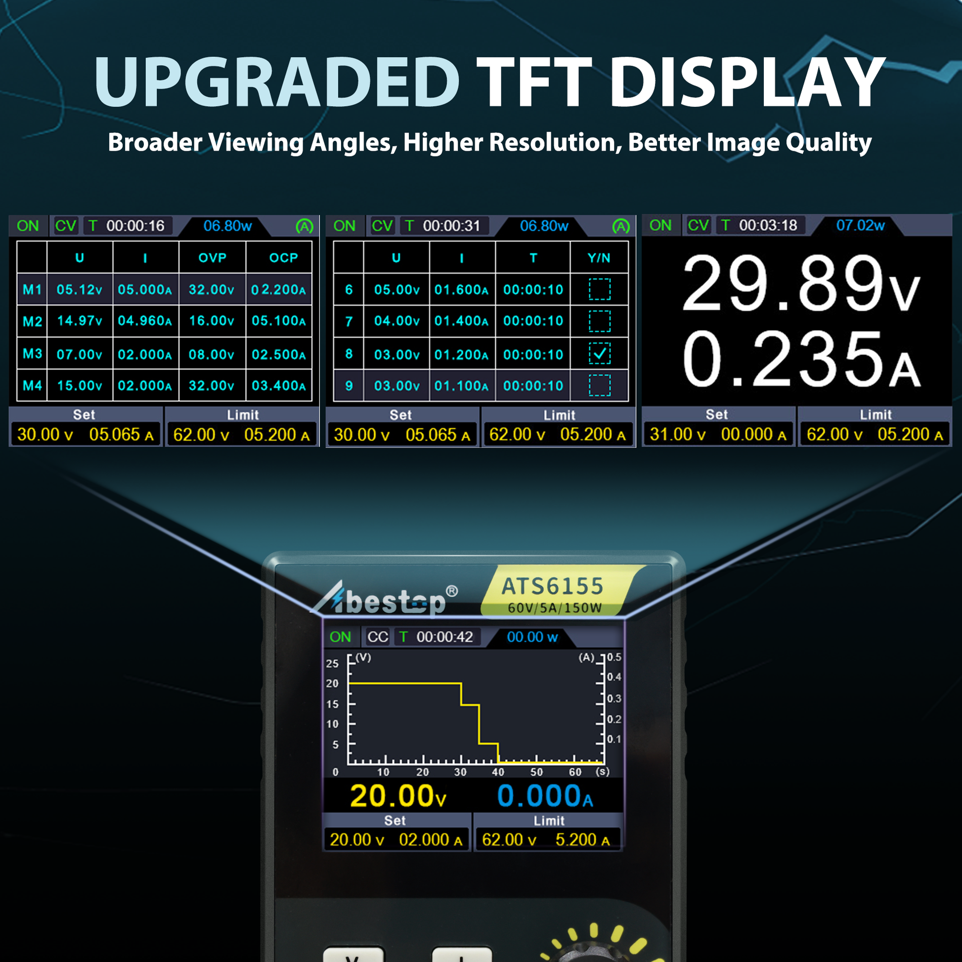 - Parameter: ATS6155 dc power supply with 60V/5A output range, 150W output power, 10mV/1mA output solutions, 85V-265V AC(45-65HZ) INPUT VOLTAGE, Fuse 250V/5A; Support list waveform editing and output, 4 groups of memory shortcut parameters for quick output