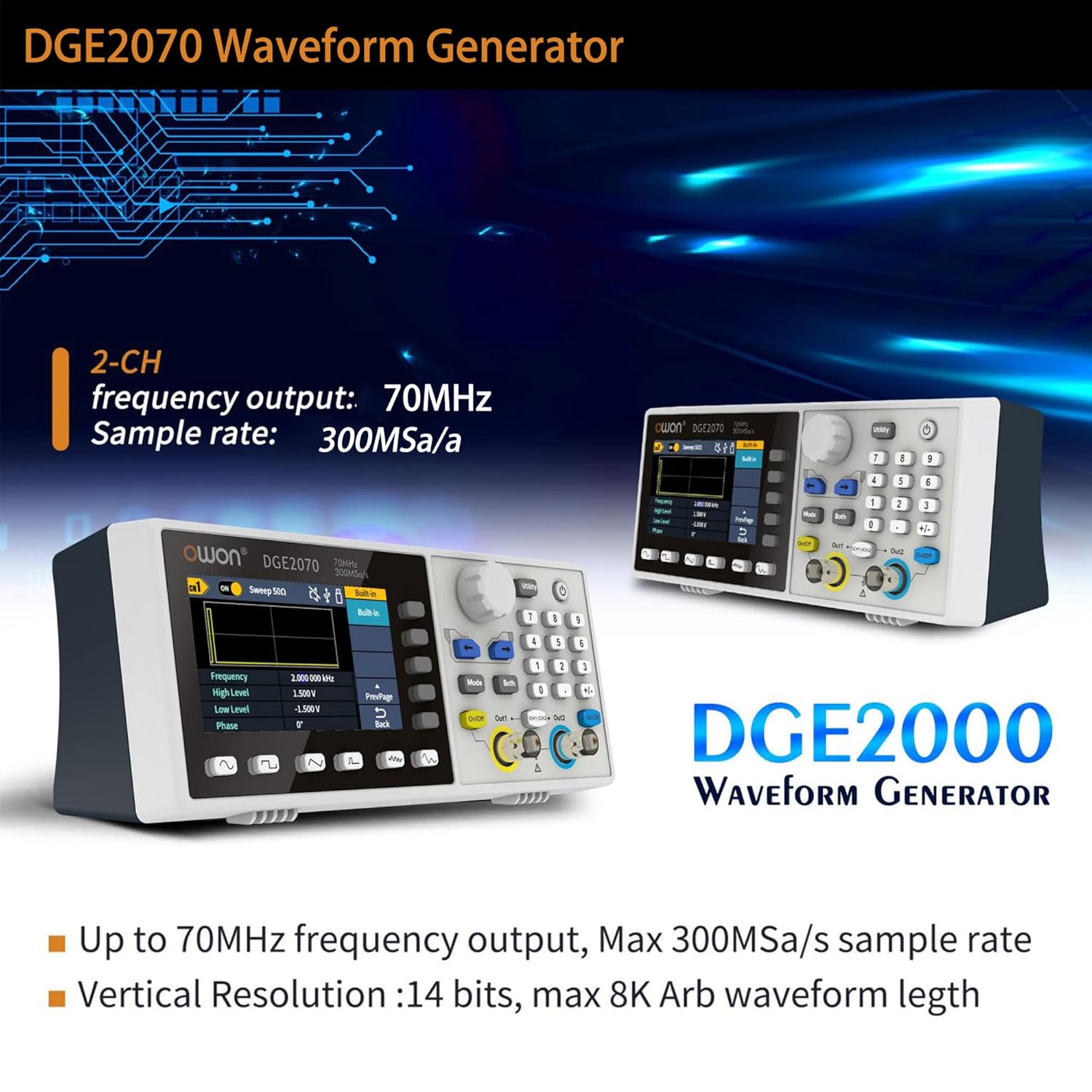 - Parameter:Dual channel waveform generator, 70MHz frequency output; Max 300MSa/s Sample rate,Vertical resolution 1μHz; 14 bits Vertical Resolution, 8K Arb waveform length