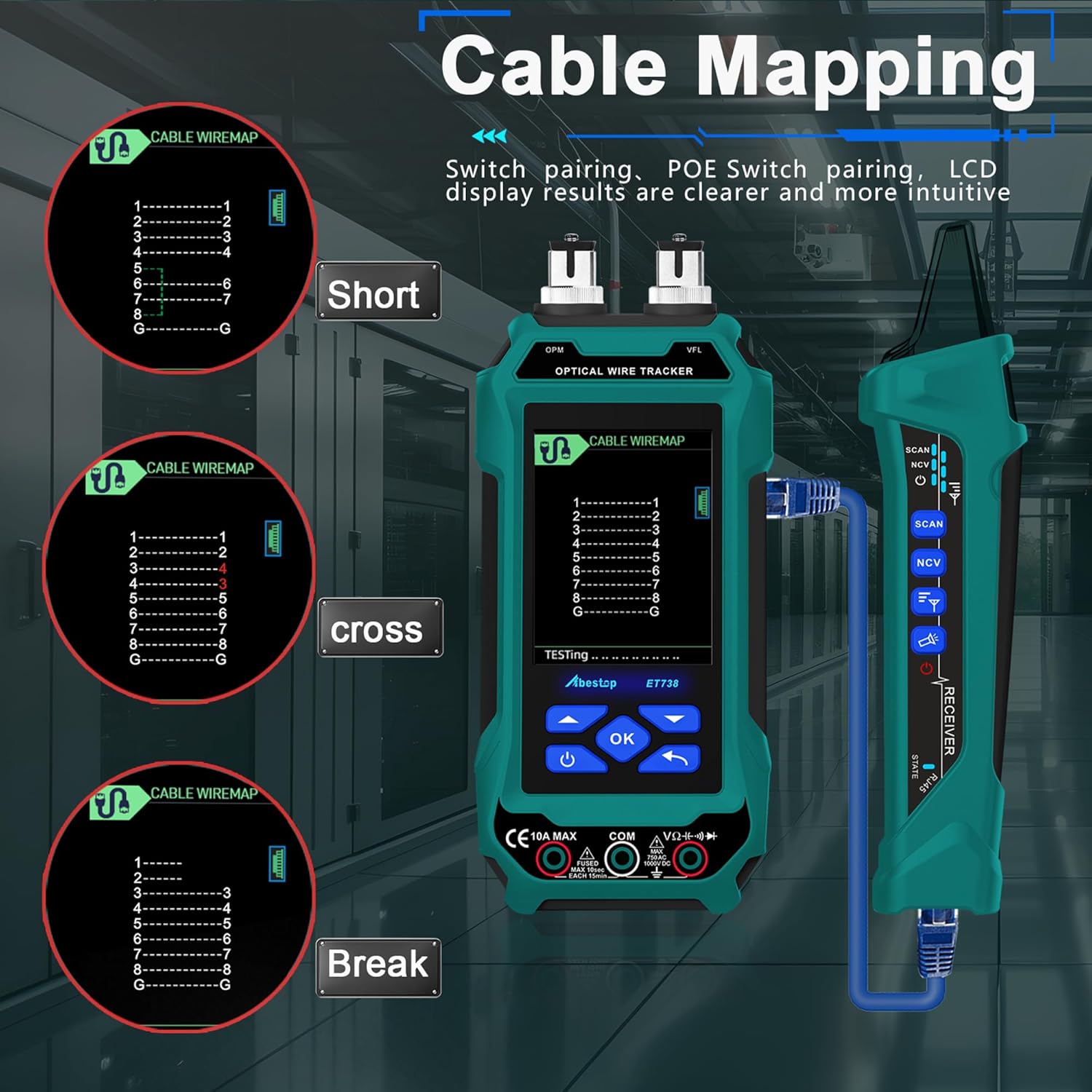 ET738 Abestop 2 in 1 Network Cable Tester with Digital Multimeter Functions Design of 6dBm to 70dBm Optical Power Meter with 3.2" LCD