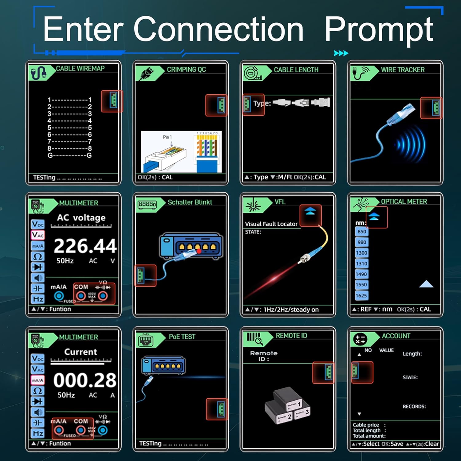 - Built-in Multi-functions: Can implement cable length measurement/ calibration, cable wiremap, wire tracker(scan), crystal plug crimping(QC), Optical power measurement/calibration, Red laser/visual fault locator, DMM, PoE measurement and account; Comprehensive tool for network, communication line installation and engineering maintenance
