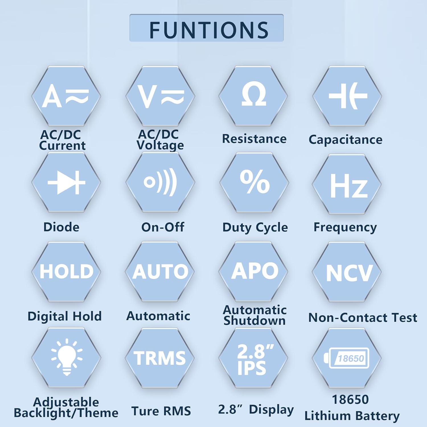 電圧、電流、抵抗、ダイオード、静電容量、導通テストに利用できます。注意: 画面にはフィルムがあり、傷がある場合があります。剥がしてご使用ください。