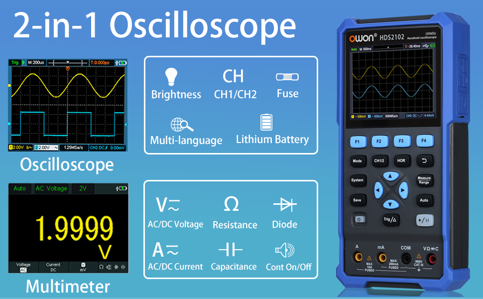- 2-in-1---2 in 1機能を備えた2CHデジタルオシロスコープ、ポータブルオシロスコープ内蔵マルチメータは非常に便利です。仕事も実験も 1 台のデバイスでうまく作業できます。同時に、その検出日は非常に正確で、20,000 カウントの DMM、10k/s のスコープ更新レート、完璧な範囲の掃引時間と垂直スケールです。