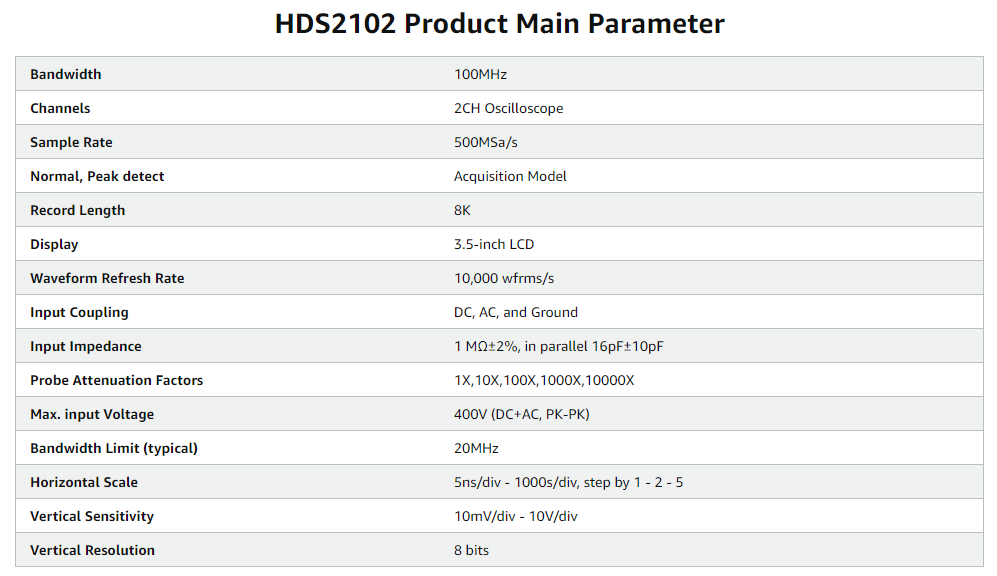 - パラメータ---OWON HDS2102 2チャンネル(オシロスコープ+マルチメーター)、100MHz帯域幅、500MS/sサンプルレート、8Kレコード長を備えた3.5インチLCDポータブルオシロスコープ。 10,000 wfrms/秒の波形リフレッシュ レート。 8 ビットの垂直解像度。 10mV/div - 10V/div 垂直感度;入力結合: DC、AC、およびグランド。