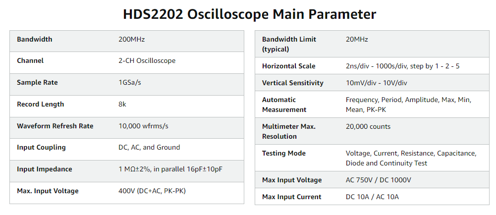 HDS2202:200MHz帯域幅。 1GSa/秒のサンプリングレート。 8K レコード長。 10,000 wfrms/秒の波形リフレッシュ レート。 8 ビットの垂直解像度。 10mV/div-10V/div垂直感度; 6つのテストモード; 最大入力電圧:AC 750V/DC 1000V; 最大入力電流:DC1000000000000000.0A /AC10.A :