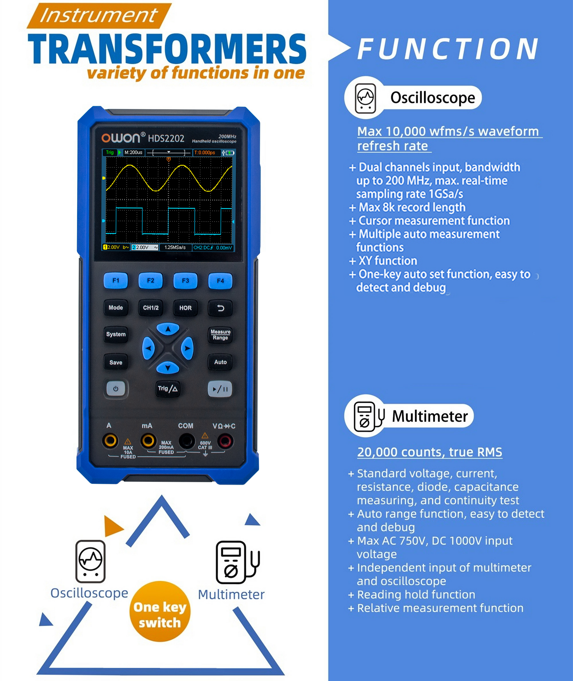 2 チャンネル: マルチメーター付き 2-in-1 ハンドヘルド オシロスコープ。 正確な検出機能、波形発生器、便利なオシロスコープのトリガ機能を備えており、分解能は20,000カウントです。