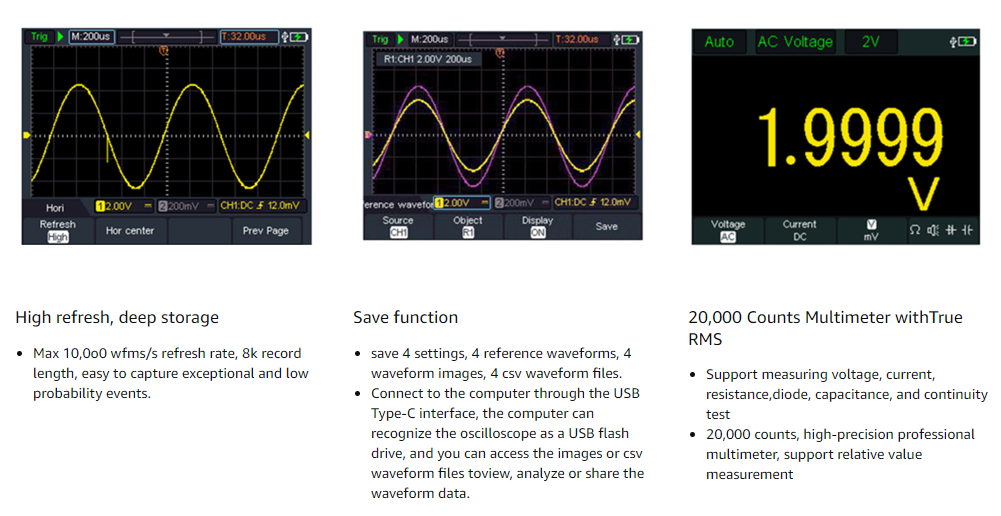 多目的 - 広く使用されているデジタル オシロスコープは、注射器や点火コイルなどの検出に使用され、自動車の診断作業に実用的です。 断続的な DC 電圧降下や産業用機器やセンサーの問題を特定します。 学校教育実験コース; その他の分野には、重電力、低電圧プロトタイピング、精密メンテナンスなどが含まれます。