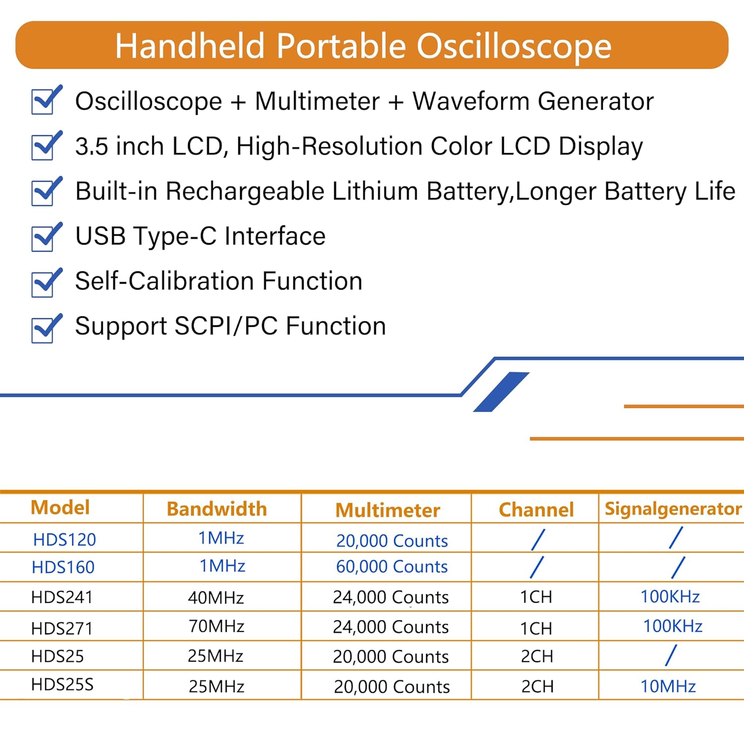 - 3 in 1 Functions, oscilloscope + multimeter+ waveform generator; 40MHz bandwidth OSC, 24000 readings digital display, 100KHz WG; Lightweight and compact size, built in rechargeable battery, easy to carry and use anytime and anywhere