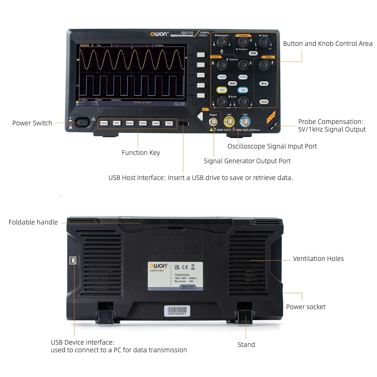 OWON SDS215S Oscilloscope 150MHz Bandwidth 2+1CH 3 in 1 Functions with 25MHz Waveform Generator Digital Multimeter 7” LCD Display 1GS/s Sample Rate for Each Channel