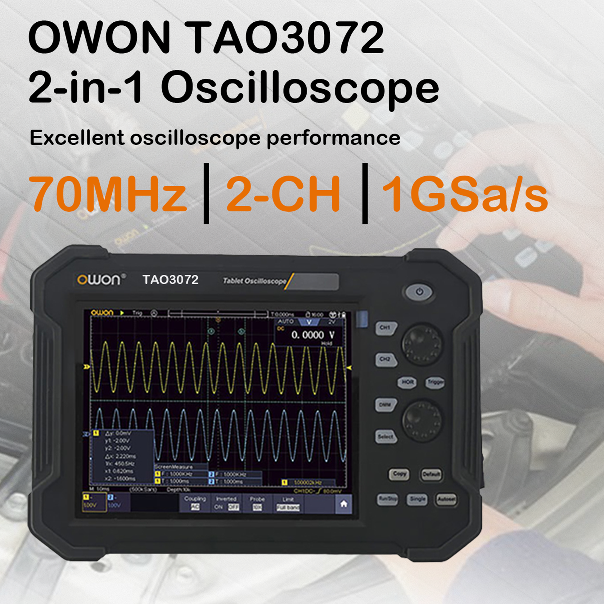 OWON TAO3072 Tablet Oscilloscope, 2 in 1 Oscilloscope and Multimeter, 2 CH 70MHz 1GS/s 8-Bit Resolution, 8 inch Touchscreen, Automotive Diagnostics, Circuit Testing, Industrial R&D, Field Testing