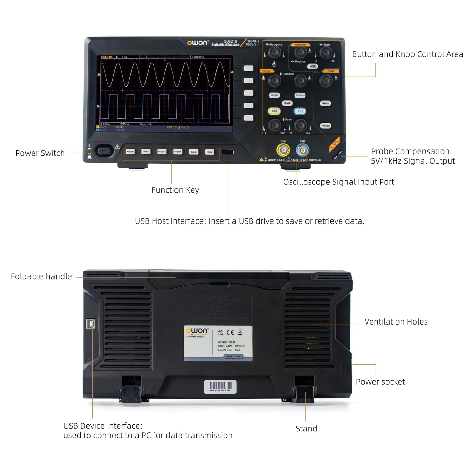 SDS210 OWON Oscilloscope 100MHz Bandwidth 2CH 1GS/s Sample Rate 20M Memory Depth 7” TFT LCD Display