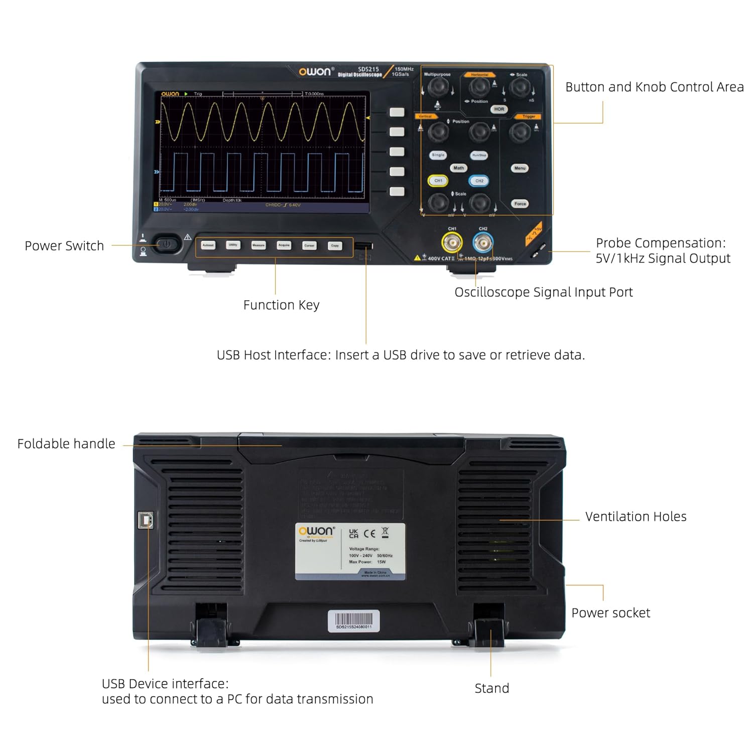 SDS215 OWON Oscilloscope 150MHz Bandwidth Dual Channel Digital Oscillograph 2 in 1 Function 7” LCD with 1GS/s Sample Rate for Each Channel
