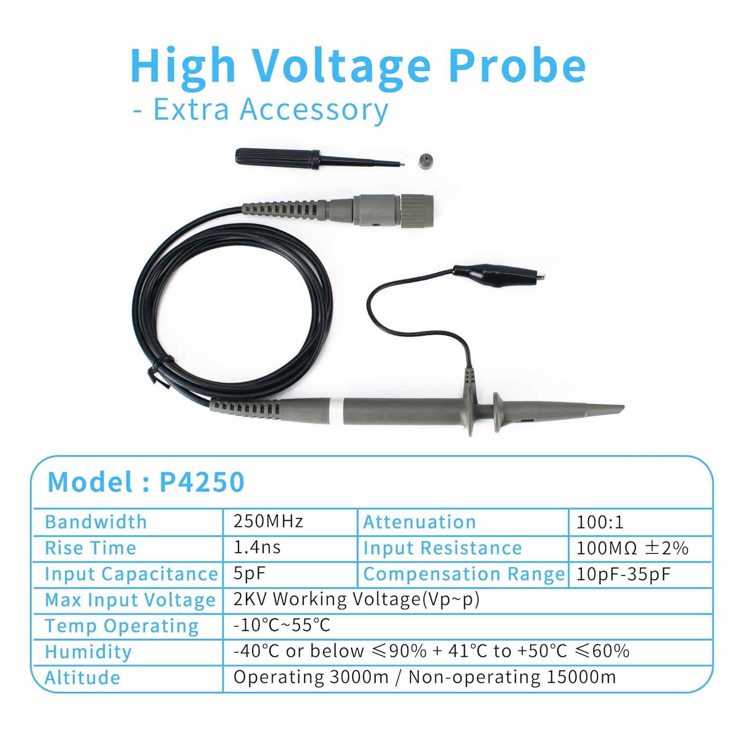 - Extra Accessory: Add a EXTRA P4250 High Voltage Probe, 250MHz Bandwidth; 100:1 Attenuation Ratio; 100MΩInput Resistance, ONLY FOR SDS215/SDS215S/SDS220/SDS220S