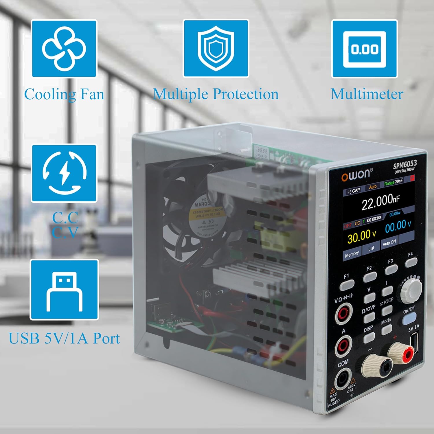 SPM6053 OWON DC Power Supply Multimeter with 4 1/2 Digits Multimeter 2 in 1 Function 10mV/1mA Resolution Bench Lab Power Supply (300W/60V/5A) 110V Input Voltage